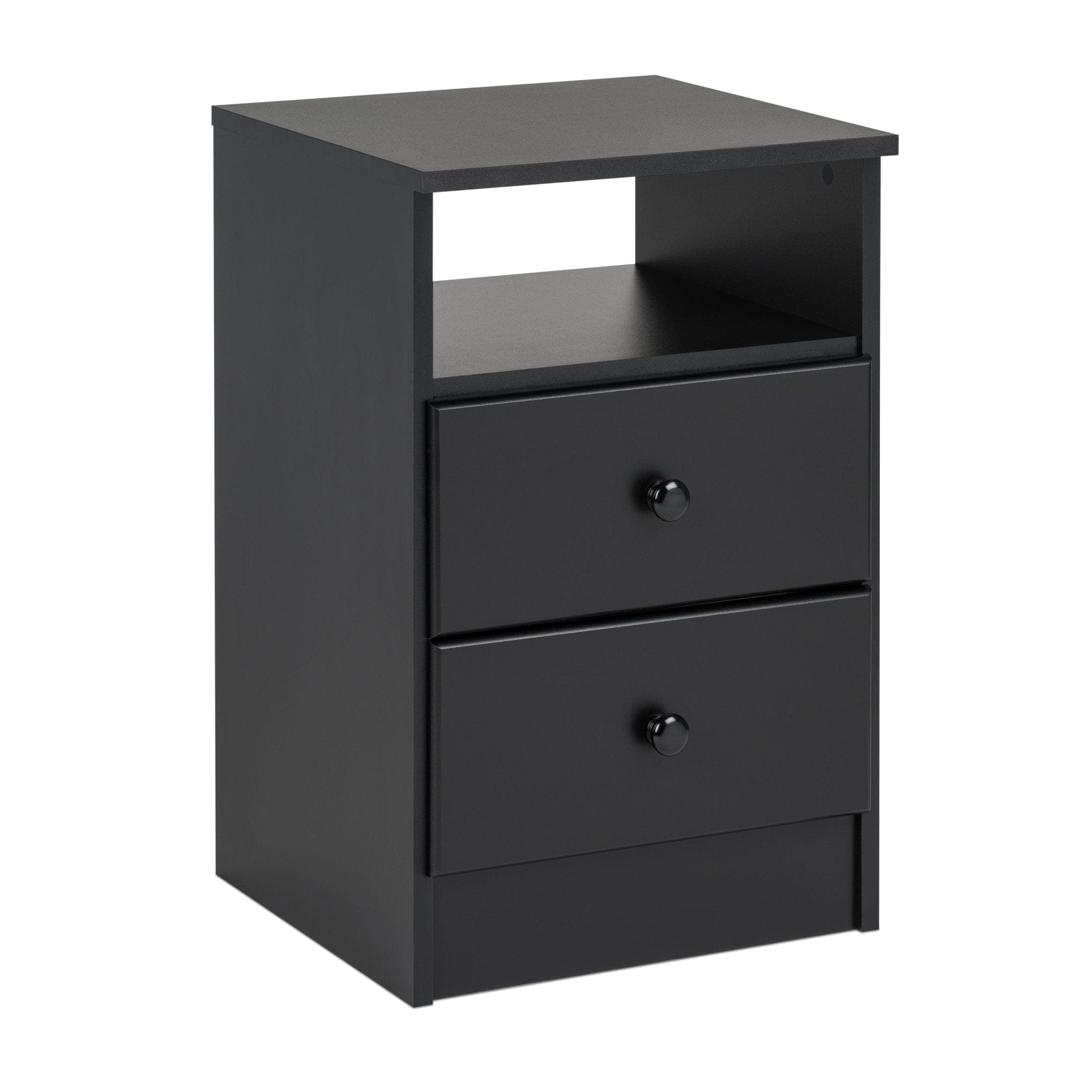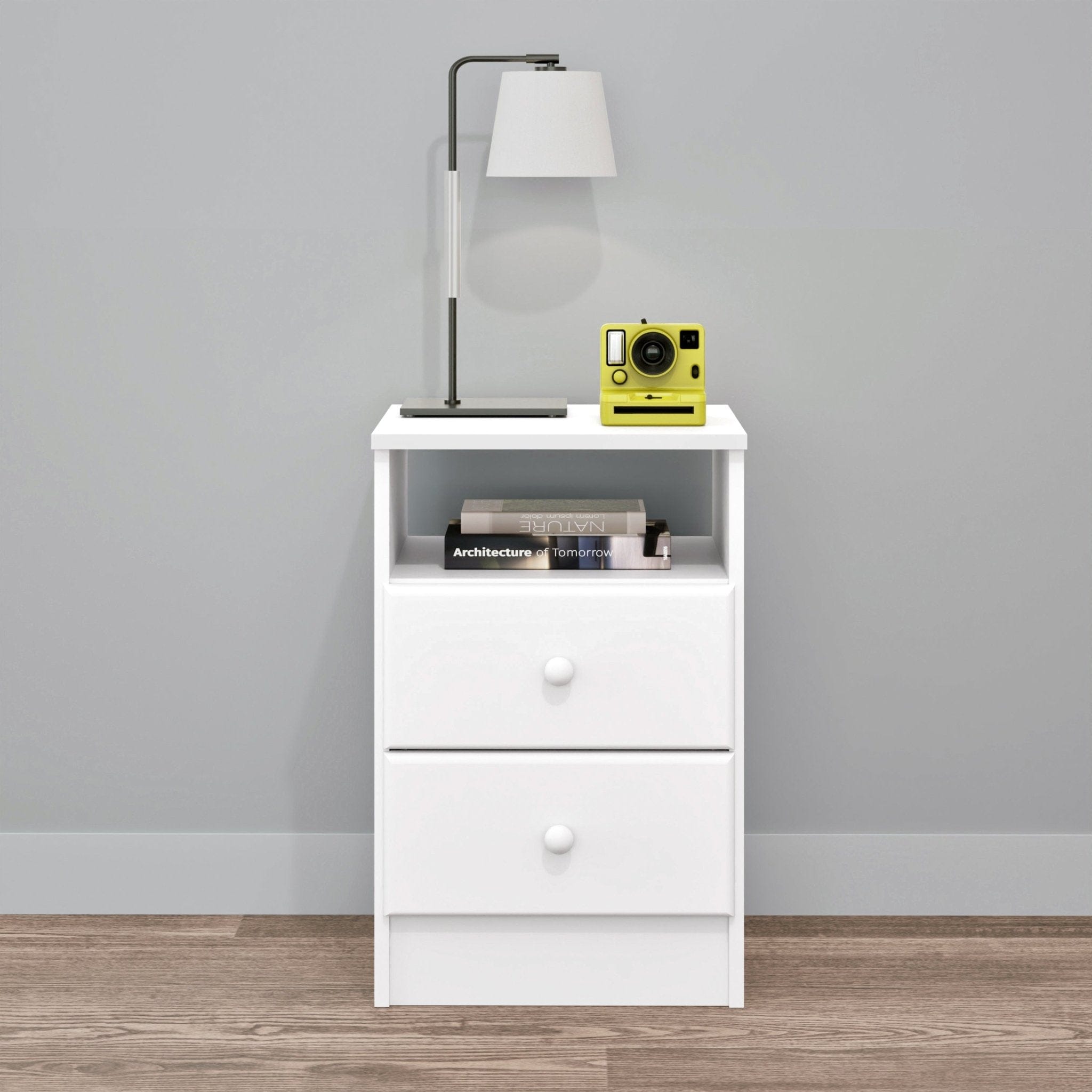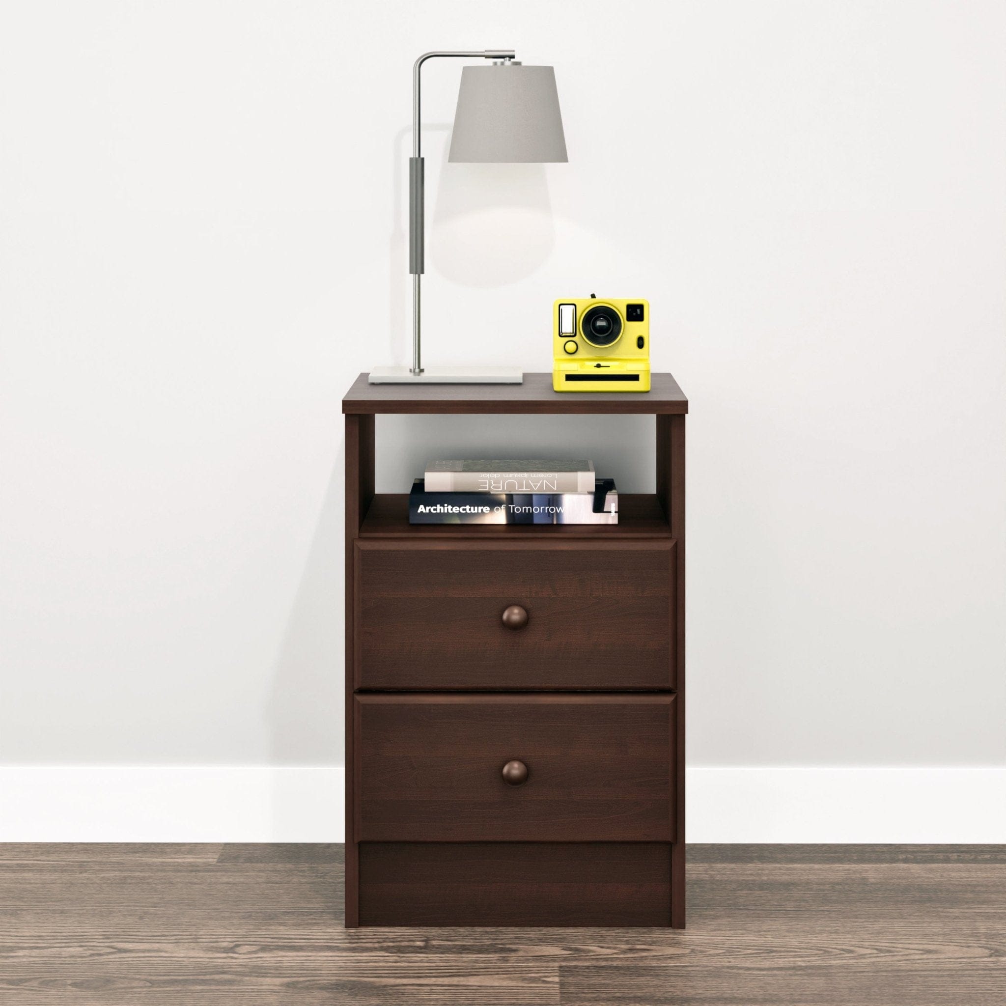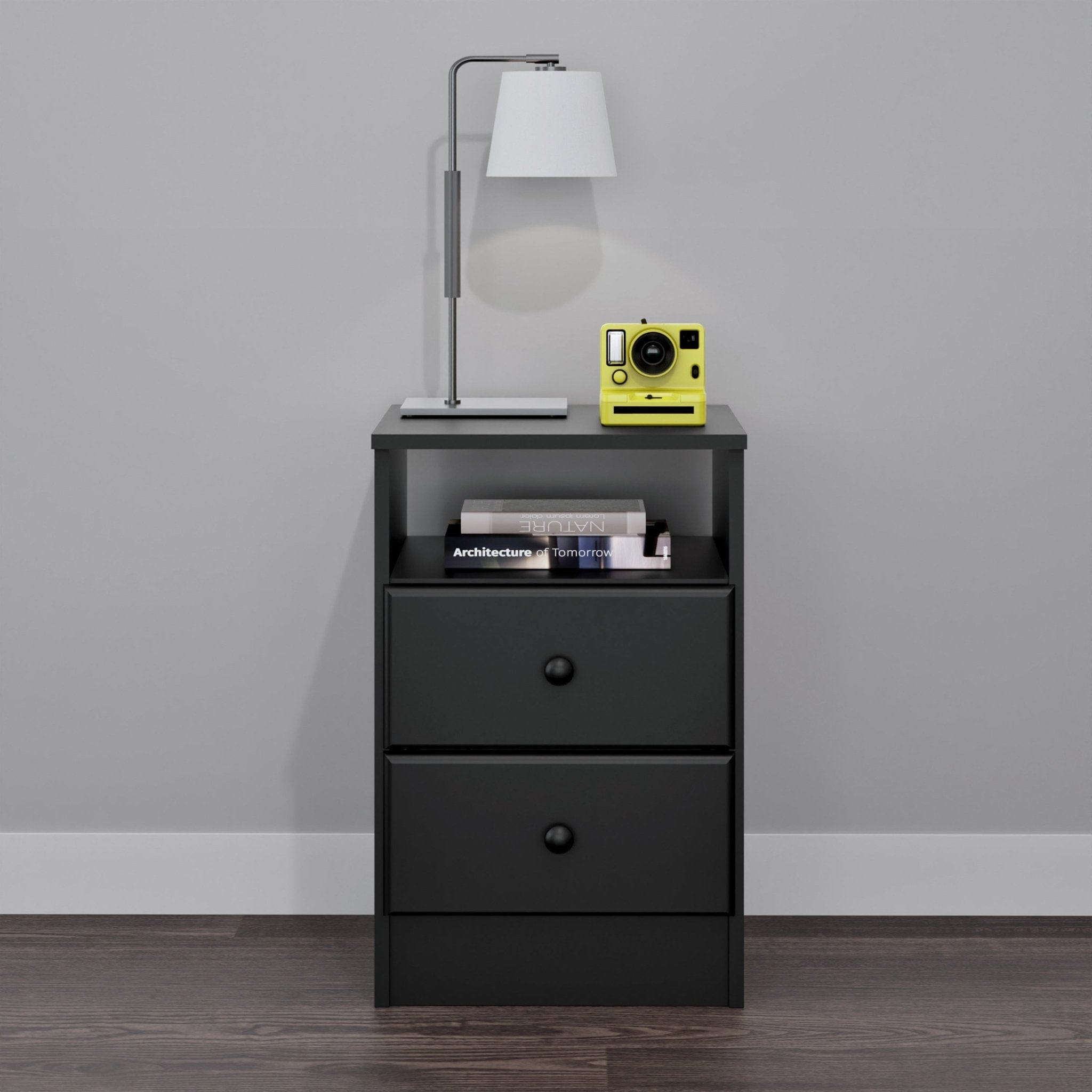 Compact 2-drawer nightstand with open shelf. Available in Black, Espresso, White, and Crystal White.