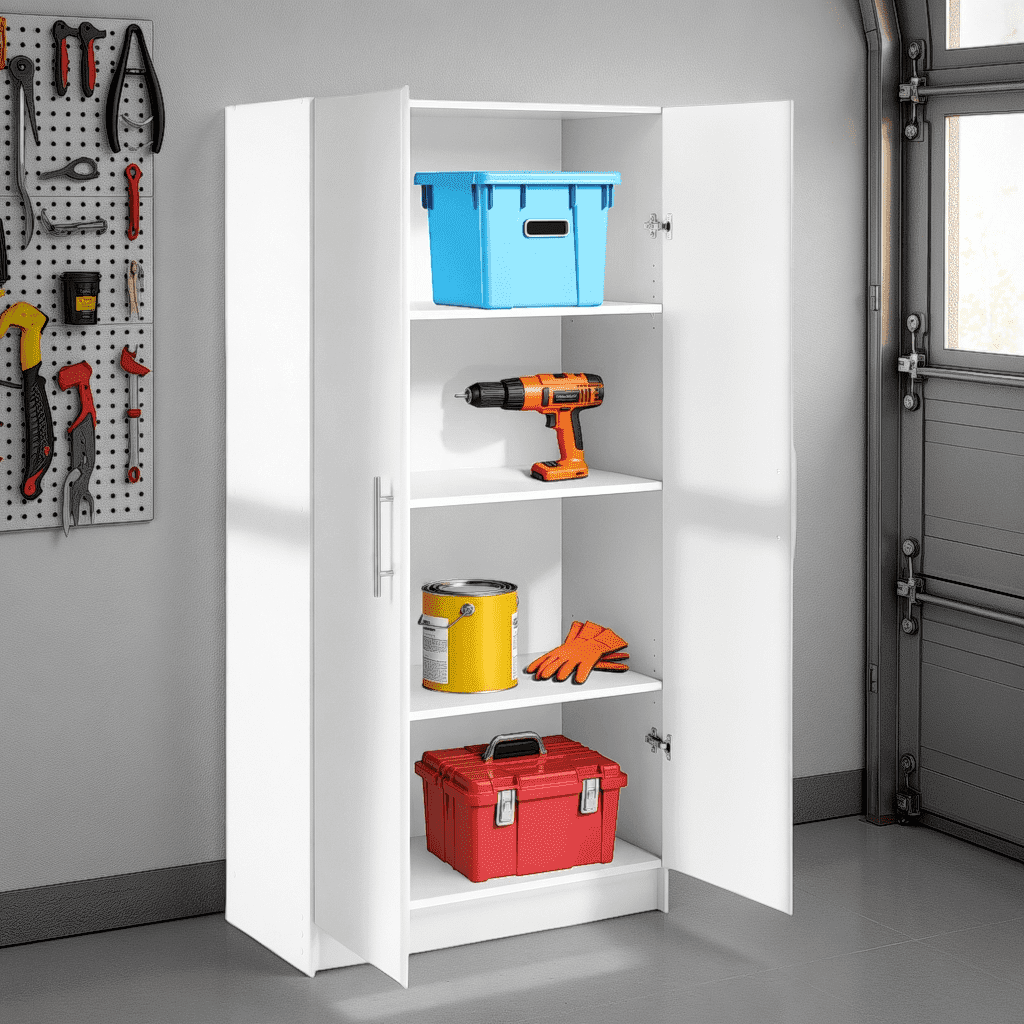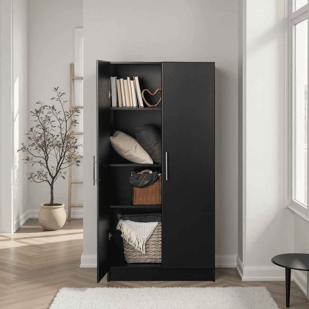 This tall two-door freestanding storage cabinet works beautifully in any room — from bedrooms to garages. Provides generous enclosed storage with adjustable interior shelving.