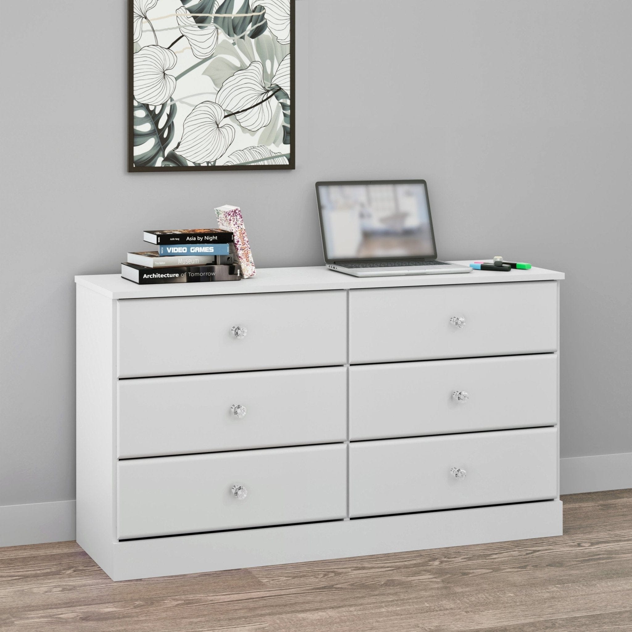 Wide 6-drawer double dresser with low-profile design. Perfect for master bedrooms in Black, Espresso, White, or Acrylic White.